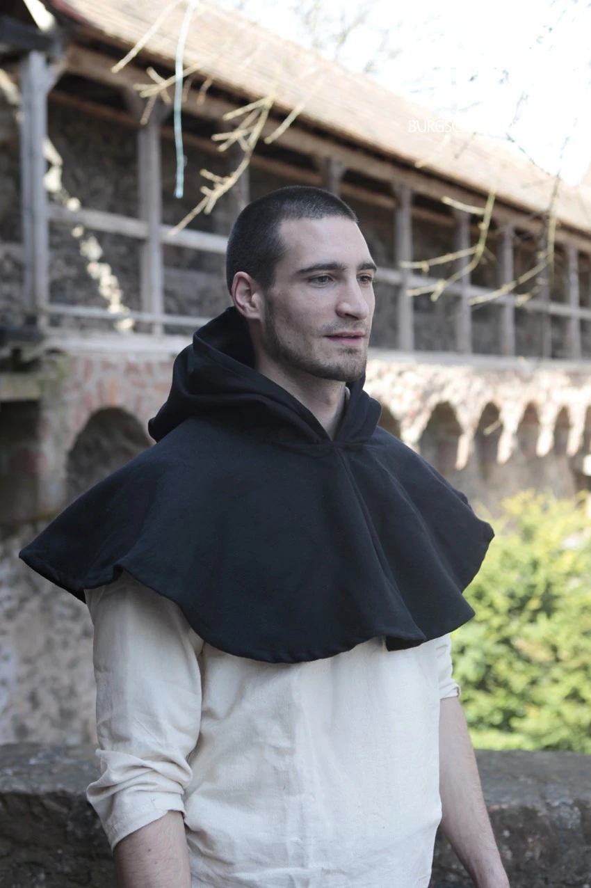Expertly crafted to the highest possible standard, this black hooded cape is made from rough uncombed black cotton and features a long pointed hood that adds yet another historically inspired dimension to this piece.