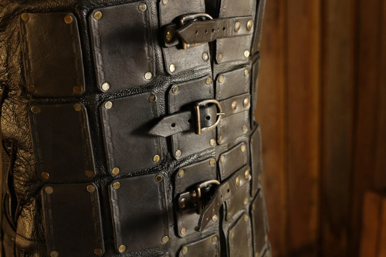 Epic Armoury’s Leather Brigandine is a torso leather armour reinforced with heavy oblongs. The armour is made from black, chrome-tanned plated-leather forming a light and durable sleeveless waist-coat base covering the torso, pelvis and upper thighs.