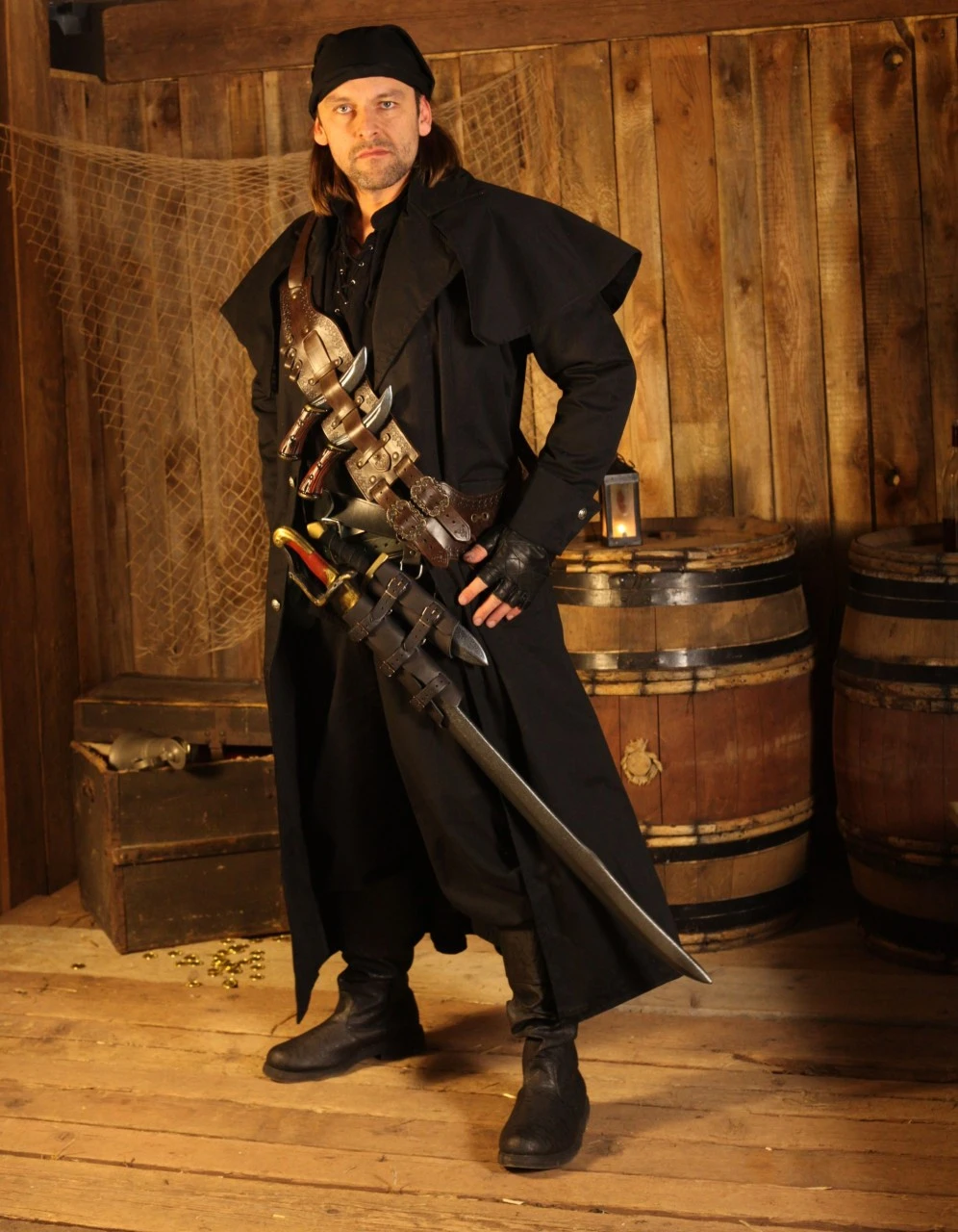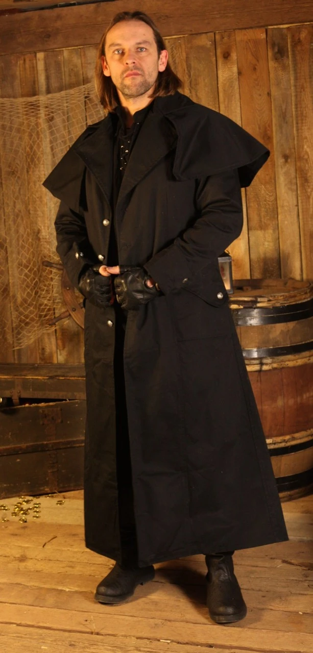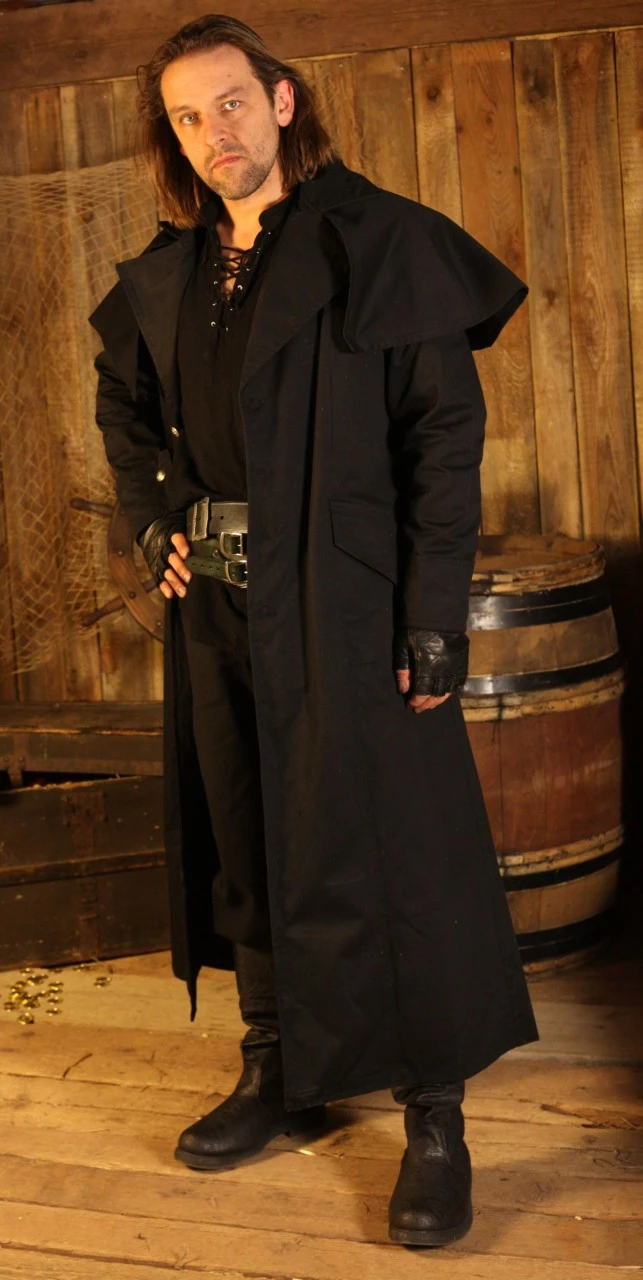 An elegant box coat that will compliment a bandit or rogue perfectly at any LARP event, allowing you to move stealthily or blend into the darkness and disappear.