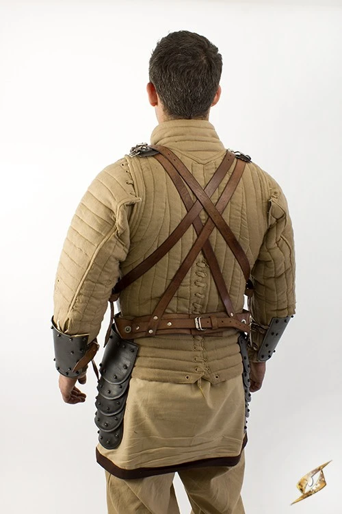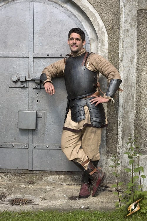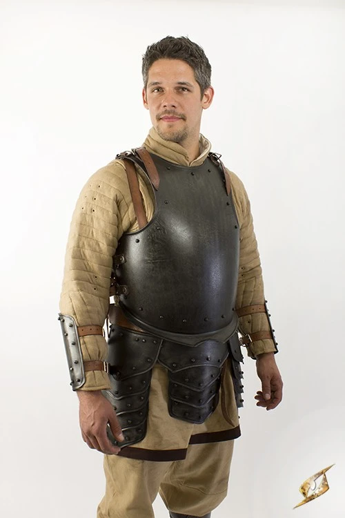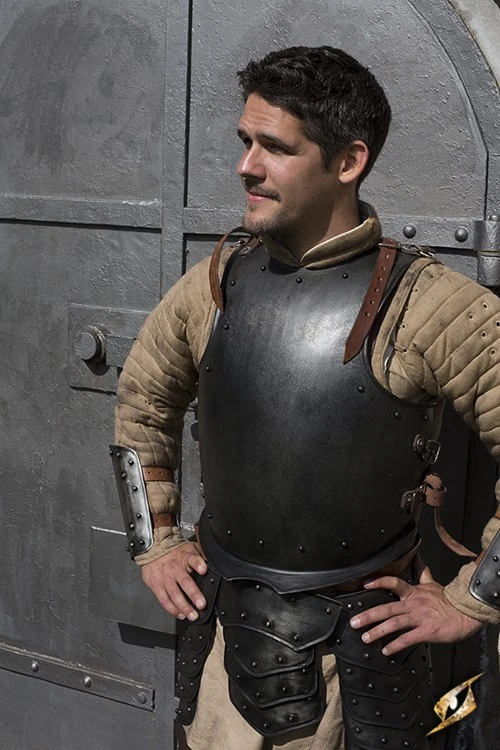 You look upon your leading officer as he makes his way down the line of your fellow soldiers. Your fate and the fate of your entire unit is dependent on this veteran’s word, and you find yourself relieved not to shoulder such a heavy burden.Historically designed with sculpted ridges and overlapping plates to provide reinforced protection and to deflect attacks on a chaotic battlefieldPlate armour became more popular as firearm technology became more prevalent during the 13th century¶Made from 1mm/19 gauge thick mild steelRolled edges with no sharp edgesStraps and fittings made from top-grain leatherHand made, welded pieces for maximum durabilityEpic Armoury Dark oxidization resistant coating¶Epic Armoury Dark products are specially treated to resist rust, but should still be treated with oil and kept in dry storage. All our metal armours contain leather parts that need regular maintenance using leather-care products to keep the leather from drying out.¶Cleaning¶If your armour does get wet, it is important that you dry it thoroughly as soon as possible.¶After handling, wearing, or after six months of storage or display, all metal should be wiped with a clean cloth. Lightly oil the clean surface with a quality machine or mineral oil. Alternatively, you can apply a coating of wax to the entire surface of exposed metal. Allow the wax to dry for a couple of hours and then buff it lightly with a soft cloth.¶Rust-Prevention and Removal¶Store your armour is a dry place and check it every couple of months for signs of rust. If any is found, remove it by gently rubbing the affected spot with a mildly abrasive pad dipped in paste wax, oil, or water-displacing liquid.¶Leather Straps and Fittings¶Clean by removing dirt with a hard brush, then gently rub on leather soap with a clean, damp cloth until the leather appears clean. Remove soap with a separate damp cloth to wipe away any soap residue and then use a dry cloth to wipe away any remaining water from the leather.¶You should always condition leather after cleaning, since the soap will have removed some of its natural oils. Treat the leather with mink oil, olive oil, or beeswax polish with a clean cloth, gently rubbing a small amount of oil or polish in circles into the leather. Allow the leather to soak in the oil before wiping the leather with a final clean cloth to remove any excess residue.¶