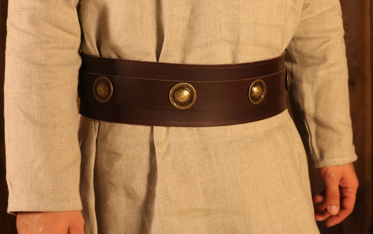Wide leather strap, onto which we have attached a leather belt, decorated with buckler rivets.