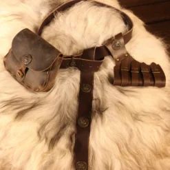 Get this Templar bundle and save 10%: a brown pouch (19x14cm), a brown sword frog with buckle & straps and a long belt. All three items are made of genuine leather and have one or more rivets “Seal of the Templar”