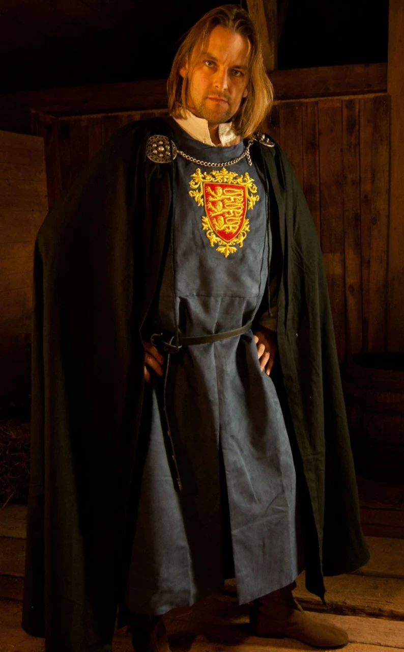 This cloak features two metal discs at the collar, which are part of the fastening system with a metal chain which attaches to both discs. Each disc features a medieval shield type design which makes it perfect for wearing over armour.