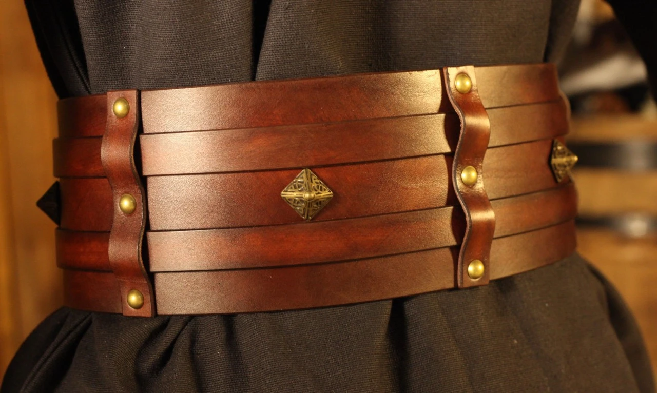 We have attached Celtic rivets in the shape of pyramids in the spaces between the belts. We are happy to swap them or leave them out if that suits your concept better.