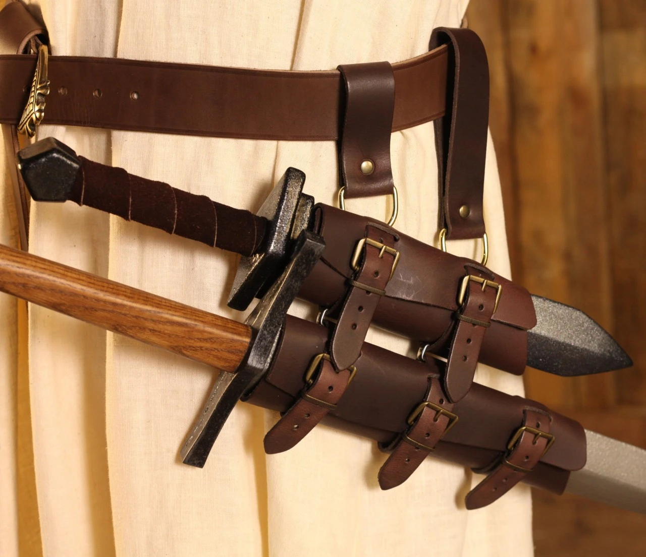 Wield two swords at once for chaotic fights or for more refined dueling keep a sword in reserve in case you are disarmed. Made from leather, the lower scabbard hangs from the upper with buckles and the upper scabbard fastens to the belt with two straps for security.