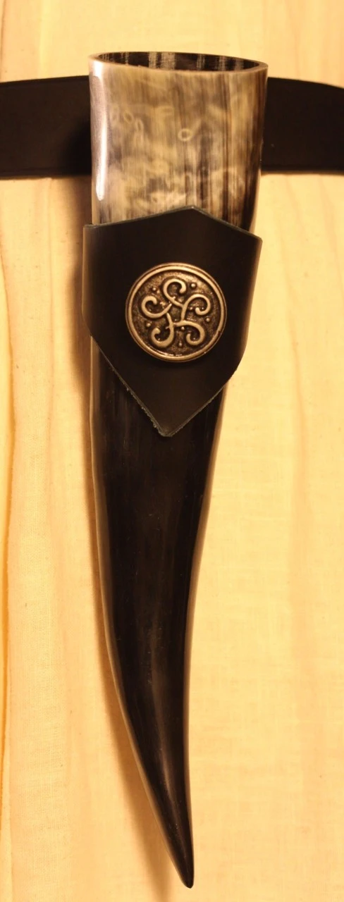 This drinking horn contains about 300ml. Smoothed and polished this fine handicraft workmanship along with a black leather holder is a real eye catcher. The holder is decorated with a Celtic Knot rivet.