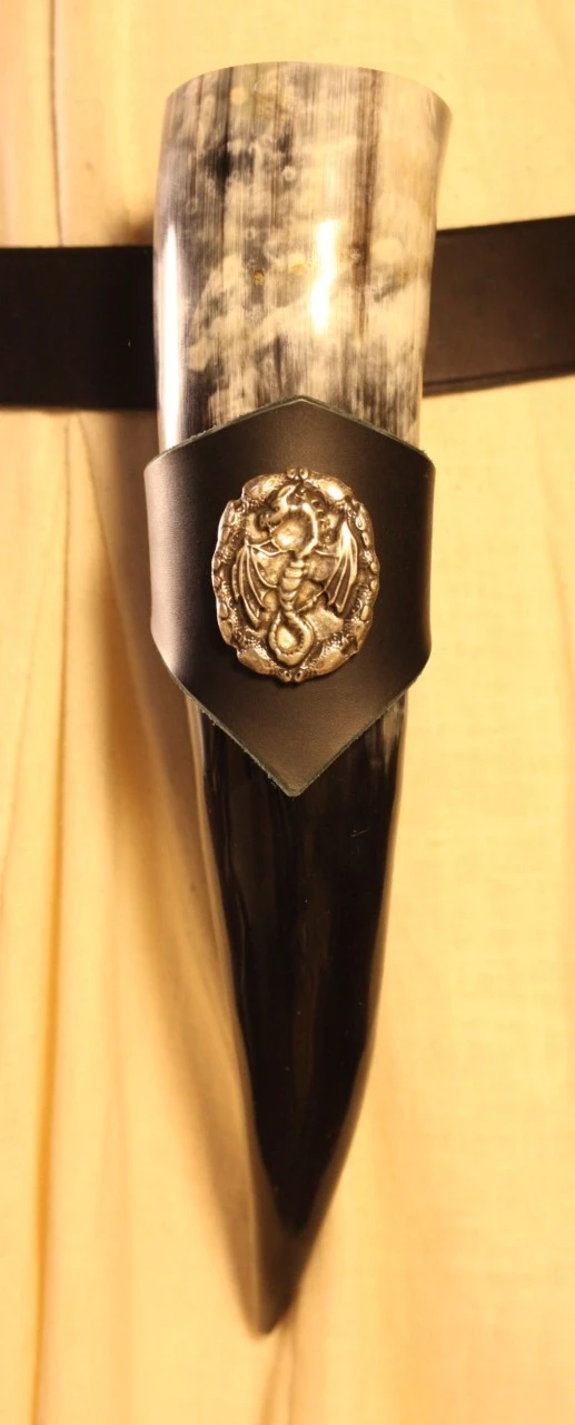 This drinking horn contains about 300ml. Smoothed and polished this fine handicraft workmanship along with a black leather holder is a real eye catcher. The holder is decorated with a Dragon rivet.