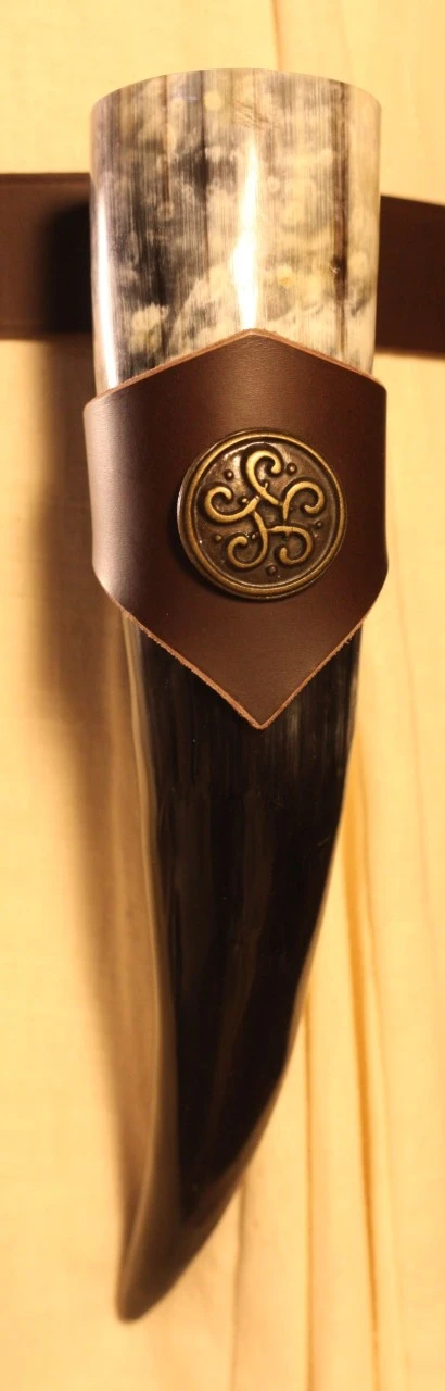 This drinking horn contains about 300ml. Smoothed and polished this fine handicraft workmanship along with a brown leather holder is a real eye catcher. The holder is decorated with a Celtic Knot rivet.