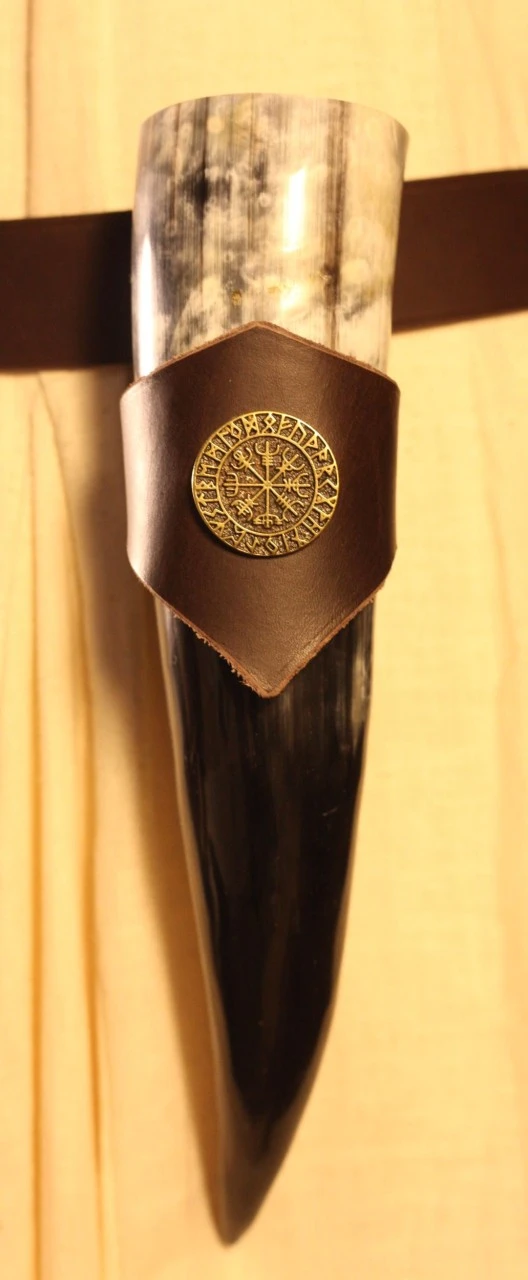 This drinking horn contains about 300ml. Smoothed and polished this fine handicraft workmanship along with a brown leather holder is a real eye catcher. The holder is decorated with a Vegvisir rivet.