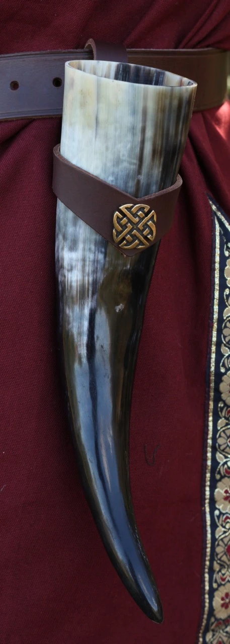 The drinking horn comes with a genuine leather holder which is decorated with a Viking rivet to add even more character to the item. The leather is available in black or dark brown.