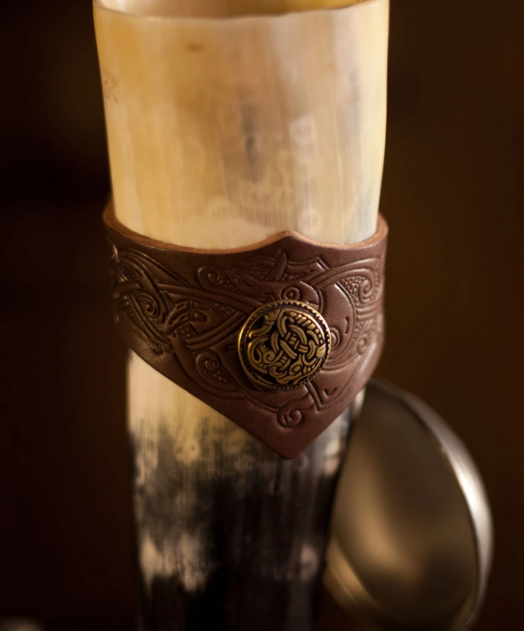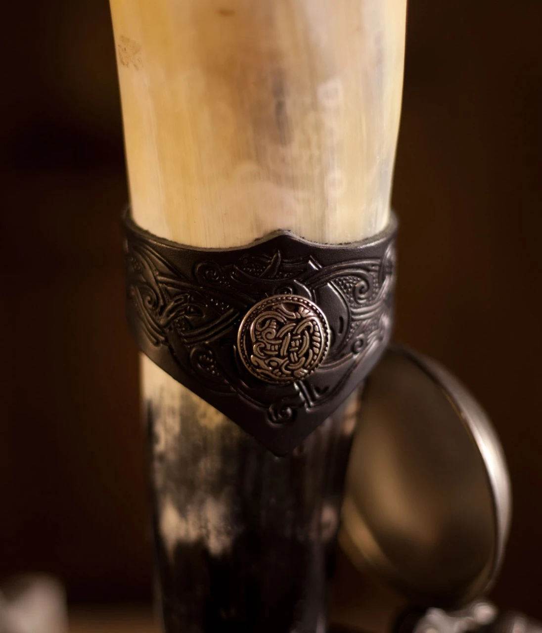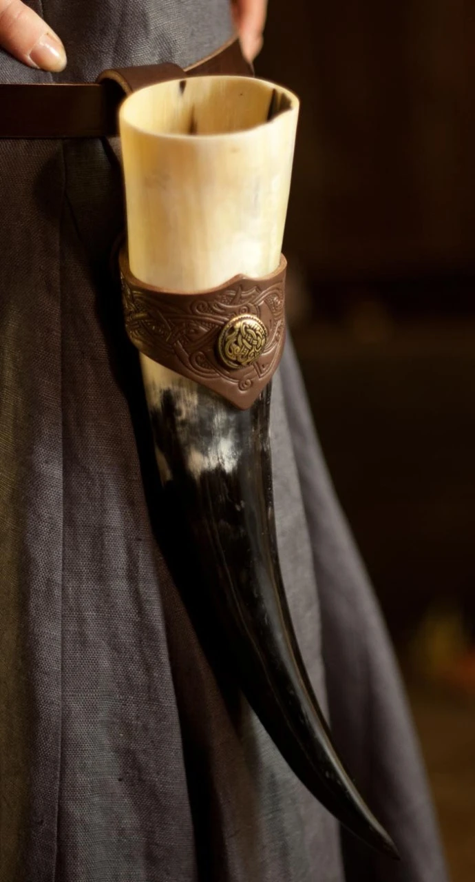 The horn is smoothed and polished and can hold appr. 300-450ml of liquid, whether it’s wine, water or mead. The horn comes with a genuine leather holder which makes it easy to add as an accessory to your outfit as well as ease of access for filling and drinking.