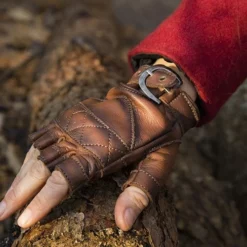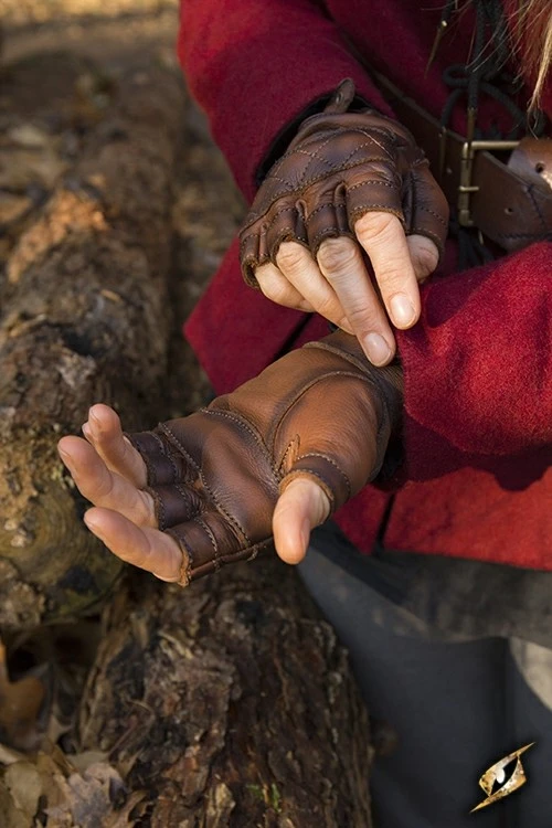 Brown fingerless leather gloves with an authentic quilted appearance, the perfect accessory for archers and for character who have ranged attacks.