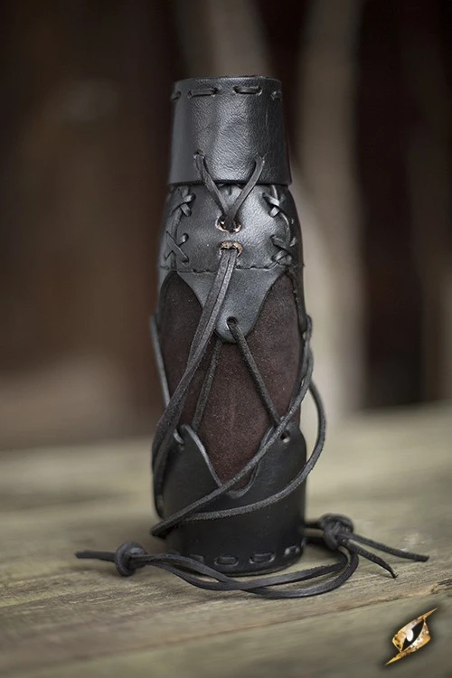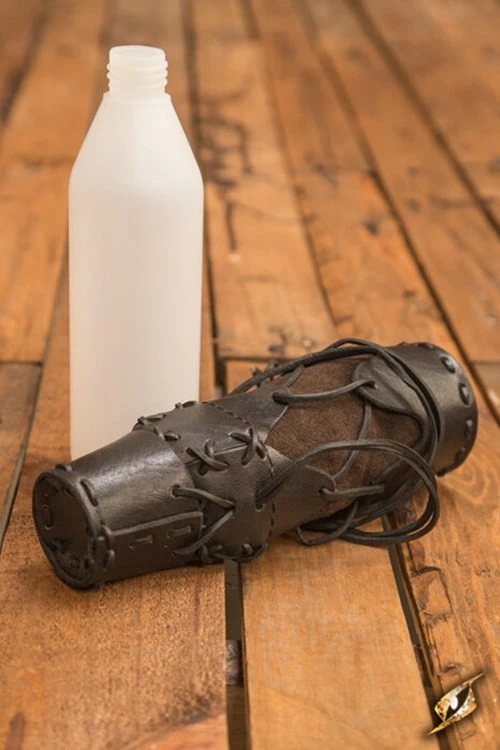Epic Armoury’s Laced Bottle Holder is a leather pouch designed to disguise your out-of-character drink bottle. There’s no reason to forgo your favourite beverages due to bad immersion! Enjoy a crisp 500 ml (or approximately 16.9 US fluid ounce) soda in the heat of summer by hiding the plastic with our extremely adjustable and attractive bottle holder.