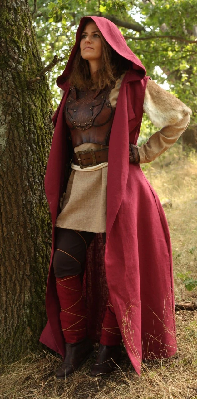 Our long hooded robe, made of red linen. The big hood is lined and gives you the possibility to travel incognito if you want to.