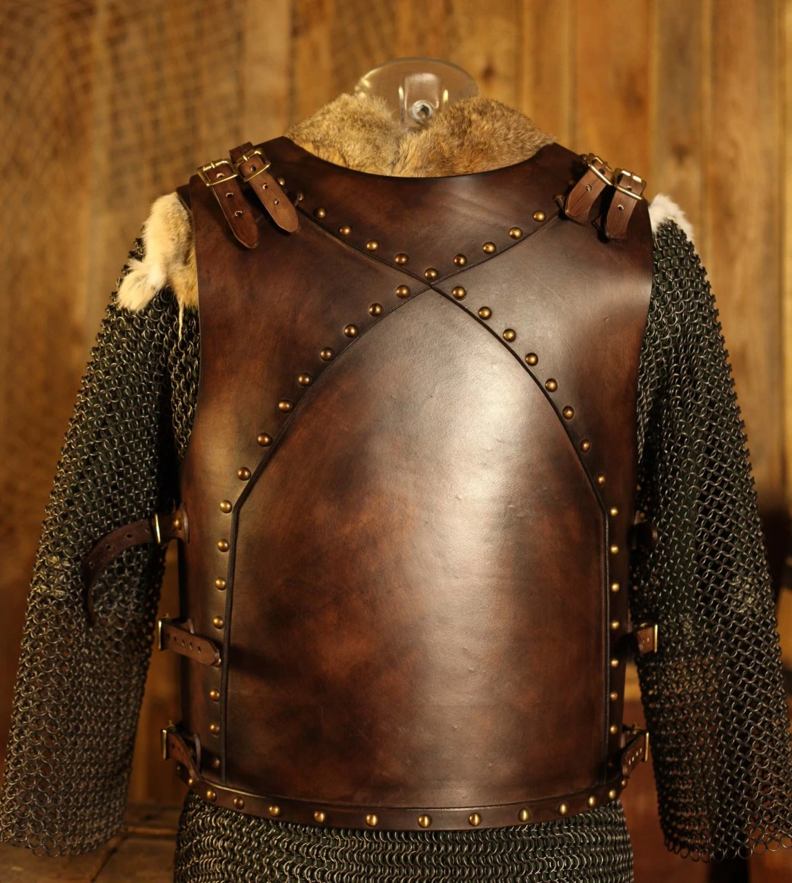 This armour has been hand built, hand riveted dyed and antiqued and distressed (aged) and displays a beautifully simple etch.