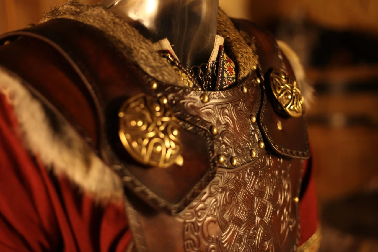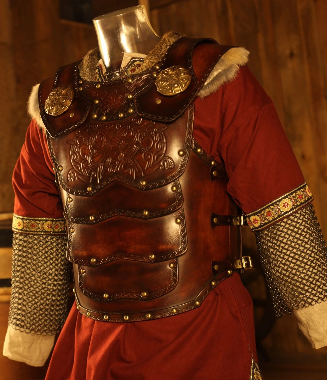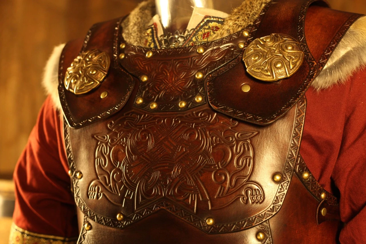 The leather armour shows norse wolf art.