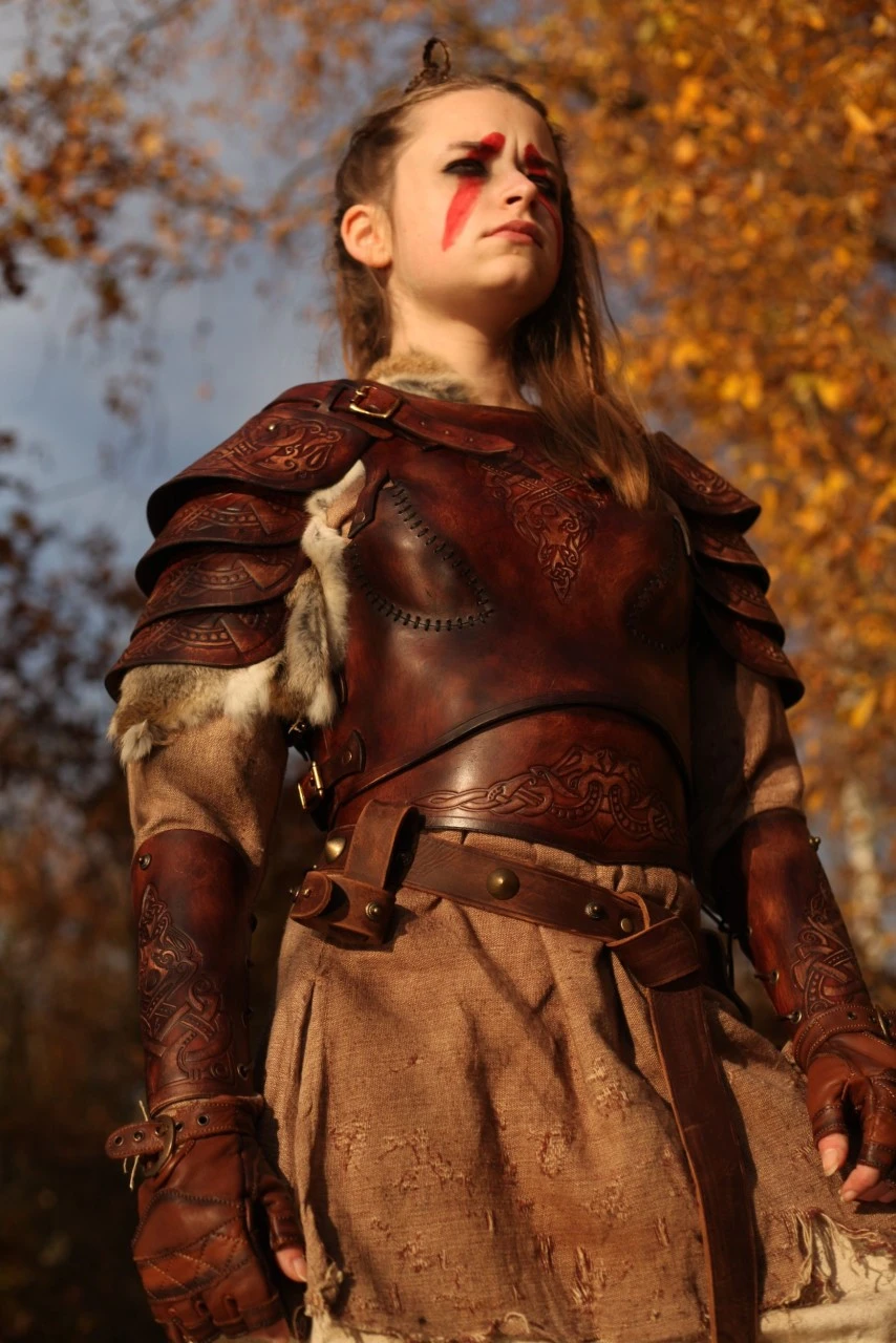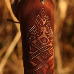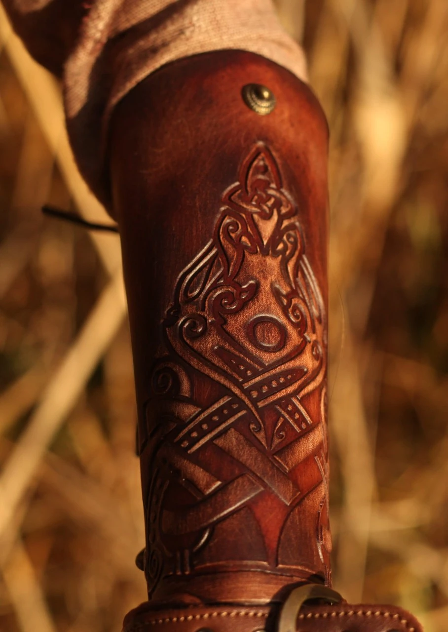 A pair of vambraces, matching the The Shield Maiden Armour has been hand made of hand dyed & embossed veg tanned top grade leather and is available in  3.2mm layered leather