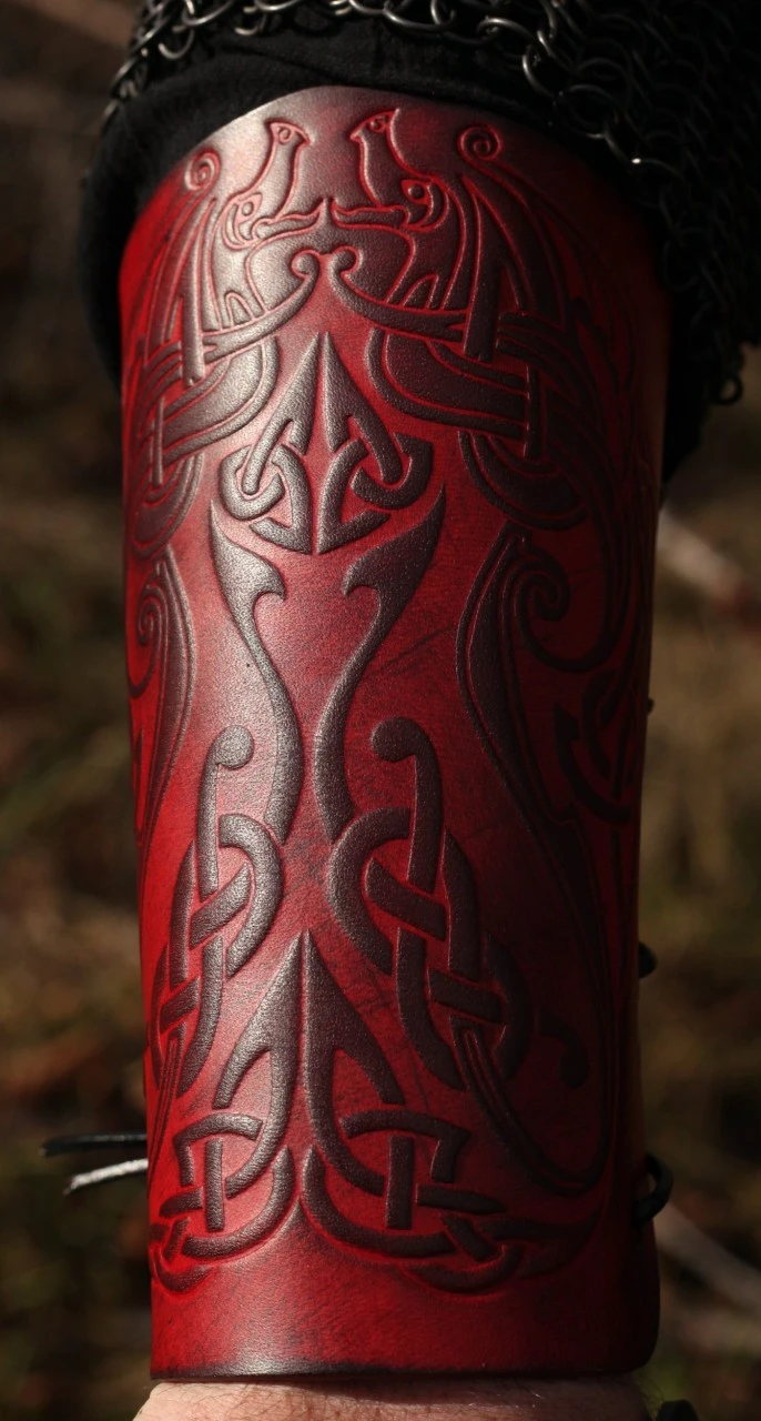 Leather Vambraces Raven, made of 3.5mm veg tan leather, embossed with a norse dragon design.