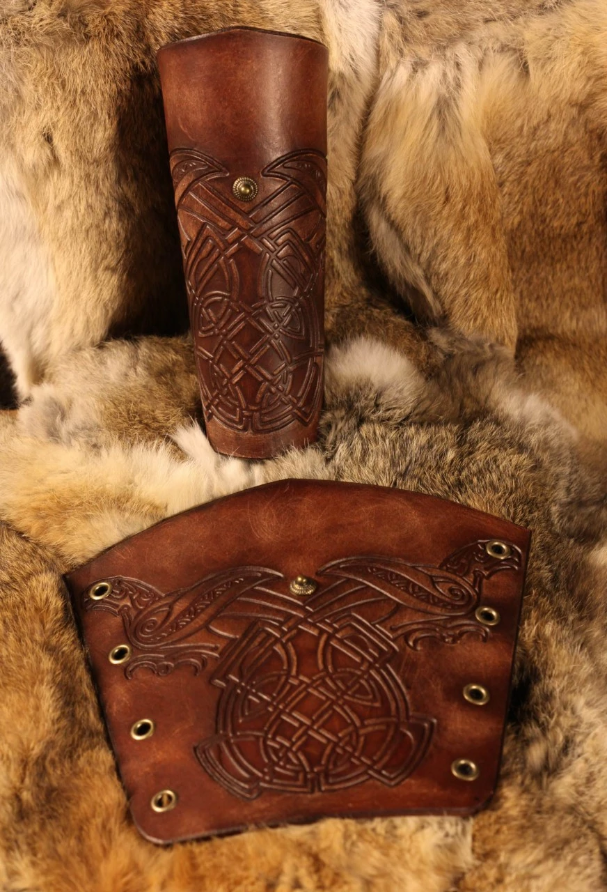 Leather Vambraces Raven, made of 3.5mm veg tan leather, embossed with a norse raven design.