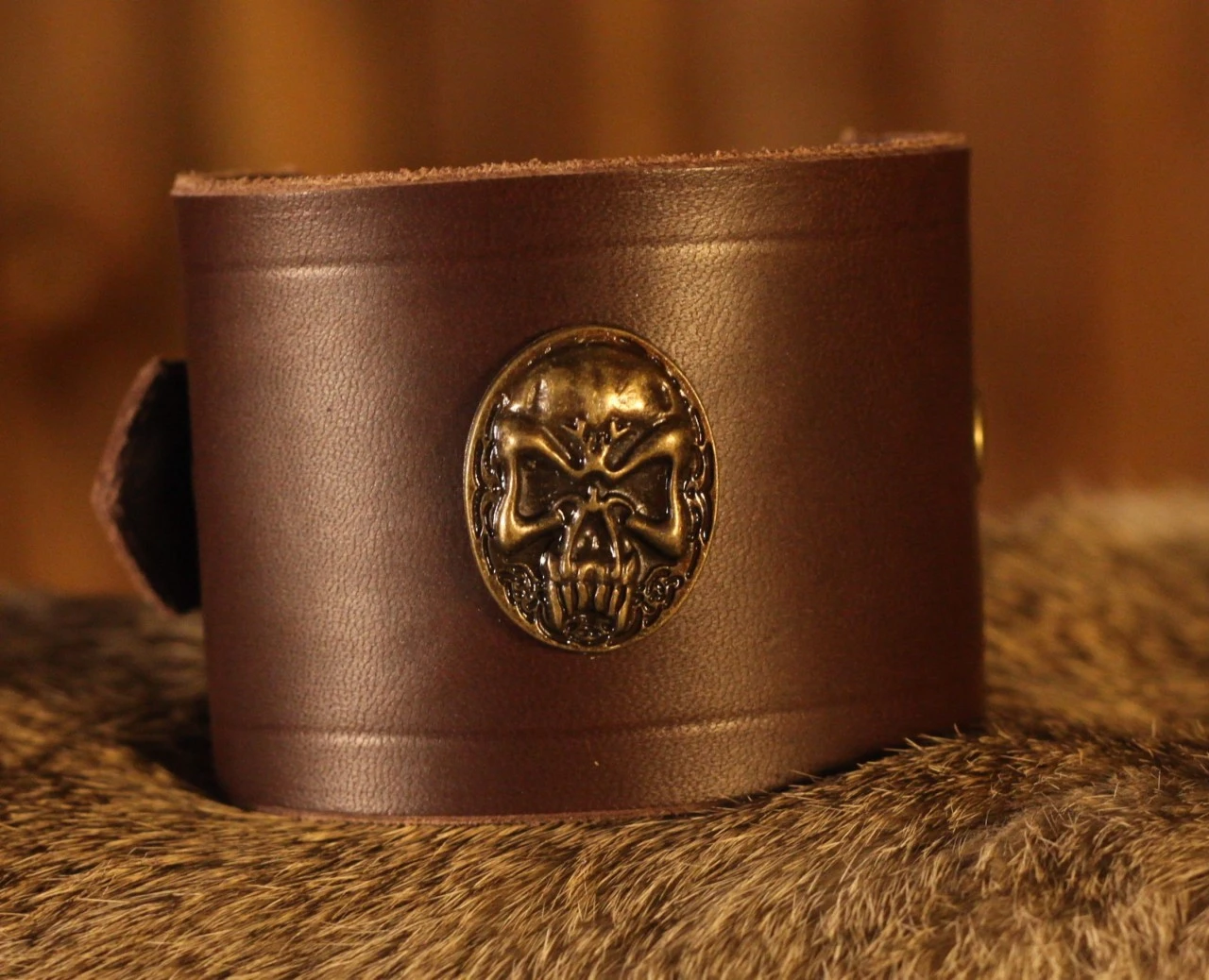 The bracelet is embellished with a rivet showing a skull