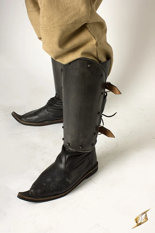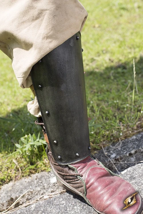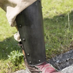 Epic Armoury’s Dark Warrior Leg Protection is a set of demi-greaves designed to protect the shins. Rounded at the edges and decorated with shiny steel rivets, these demi-greaves are designed to sit comfortably over the shins while leaving room for poleyns to cover the kneecaps. They reach from below the knee and narrow around the ankles, secured with a top-grain leather straps below the knee and another above the ankles. Each plate is treated with Epic Armoury’s Epic Dark Metal coat, which gives the armour a rugged, antique finish.