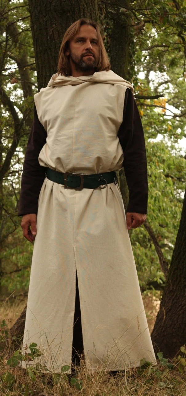 Our very new long hooded tunic, made of cream cotton. Slits in front and in the sides give you a great range of movement. The big hood is lined and gives you the possibility to travel incognito if want to.