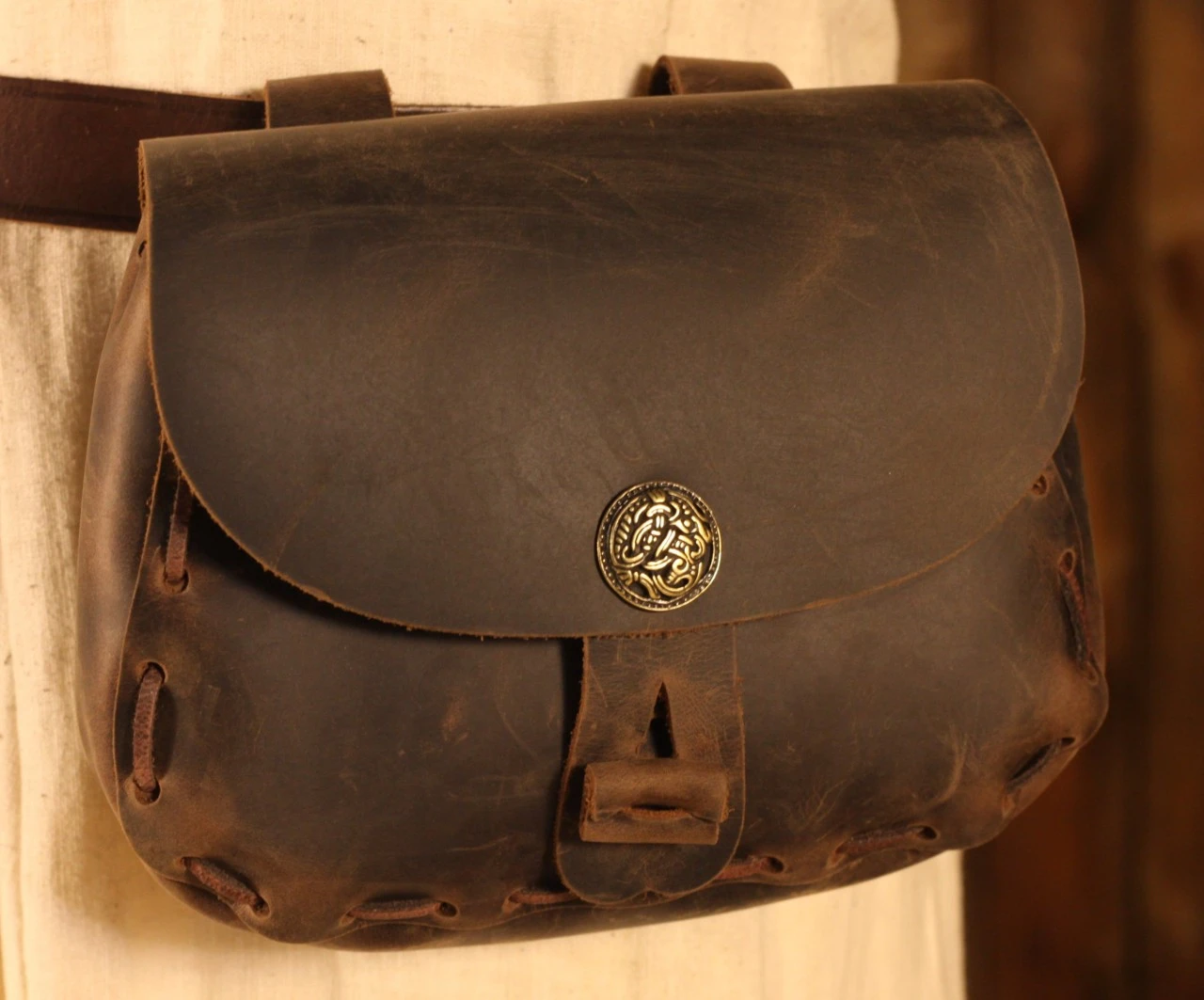 The pouch attaches to a belt with two leather loops on the back which are large enough to be compatible with belts up to 6cm wide. It is secured with a leather strap and button to keep your items safe from pickpockets or opportunists.