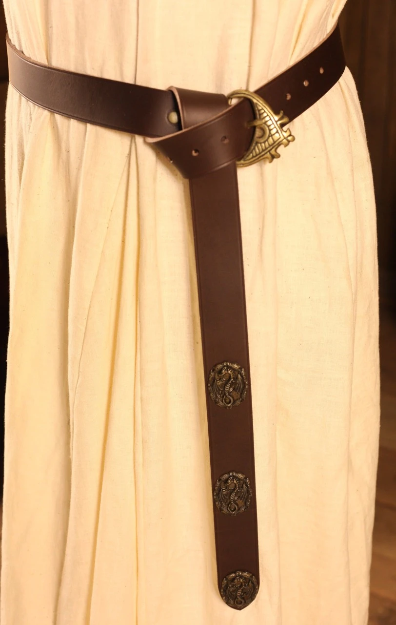 Perfect for teaming with a wide range of costumes, this Medieval inspired belt has been artfully crafted to the highest possible standard and features three decorative dragons, almost indestructible brown leather and has a number of punched holes that are suitable for waist sizes from 90cm to 108cm.