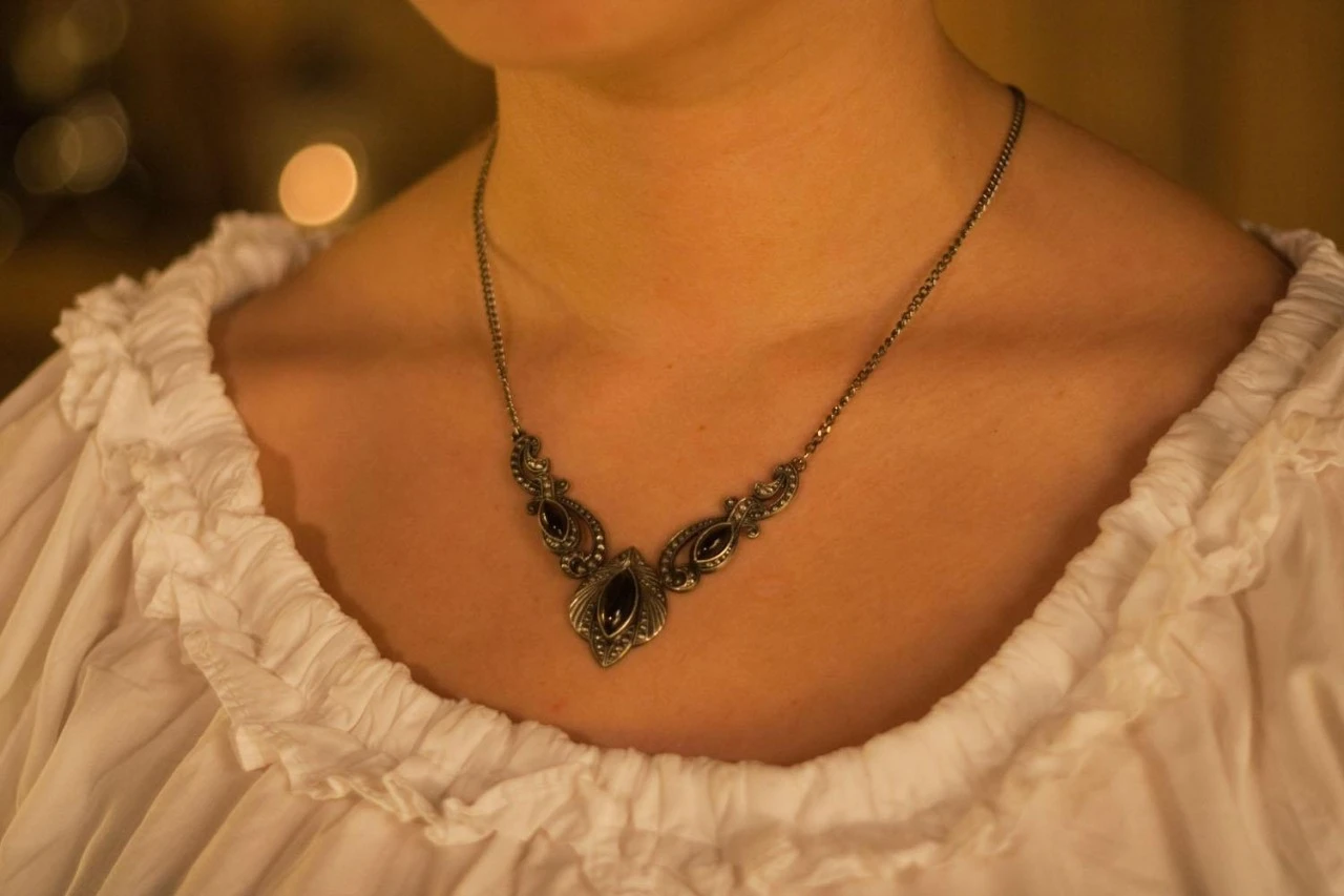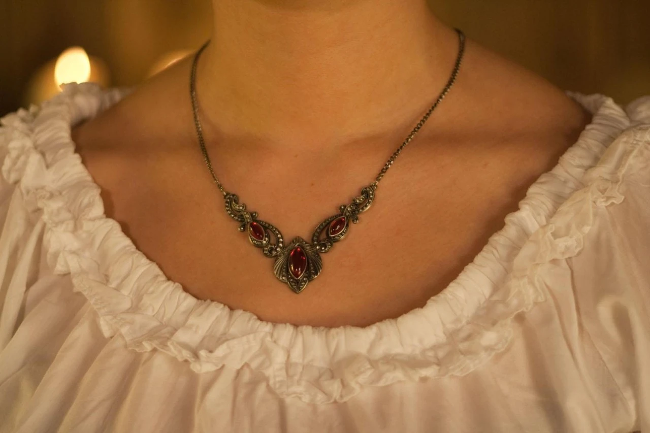 A great accessory for any Larp, cosplay, or fantasy outfit, this stunning necklace is carefully crafted from lead free tombac and decorated with premium quality glass stones.