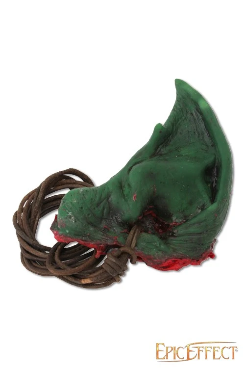 Orc Trophy Ears are a realistic-sized latex ears featured to look as if they has been cut off an Orc. A trophy ear is stuffed with cotton to give it mass and texture, with thickened, rough edges at the base as if clots of blood have coagulated where it was cut from the Orc. The ear is painted green with variations of red to imitate realistic blood clots and has the classic roughed features of an Orc ear, with drooping points and tatty lower-edge. It can be customized by carefully applying Epic Effects Make-Up. The ear has realistic feel and weight and is suspended from a leather-cord brace that goes around the neck like a talisman or amulet. It is grisly to behold and can be worn wherever you wish to make an impression or add claim of your skill and mettle.