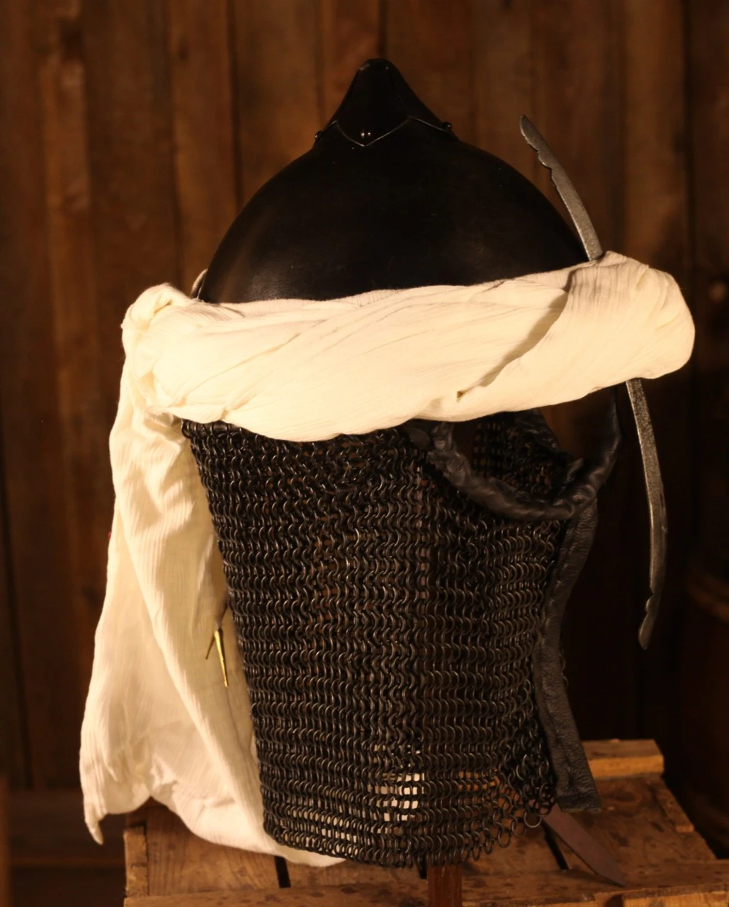 Chain mail provides protection for the neck and face and is attached directly to the helmet and around a strong metal band that forms the two eye holes. The chain mail is lined around the eyes and in front with leather.