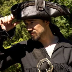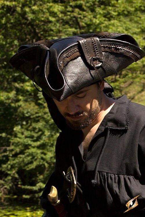 Epic Armoury’s “tricorne” Pirate Hat is handmade from natural full-grain quality leather and sturdy stitching, embellished with cotton canvas and laced leather around the brim. Inspired by popular 18th century hats of the time, its brim is turned up and pinned to form a triangle around the crown with leather lacing. With regular leather care, you can expect this hat to add a special touch to your kit for a long time!