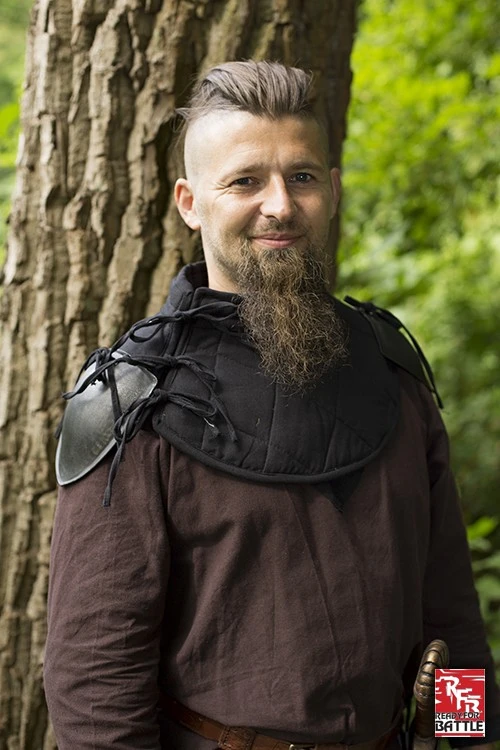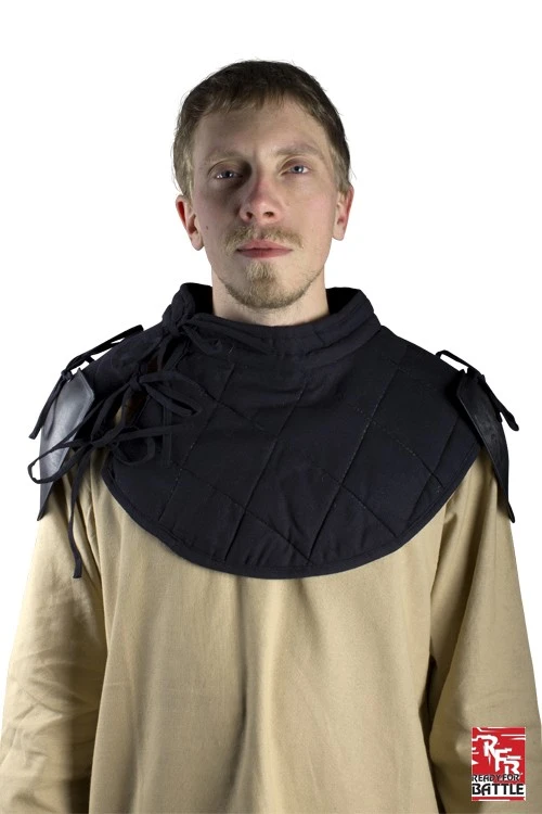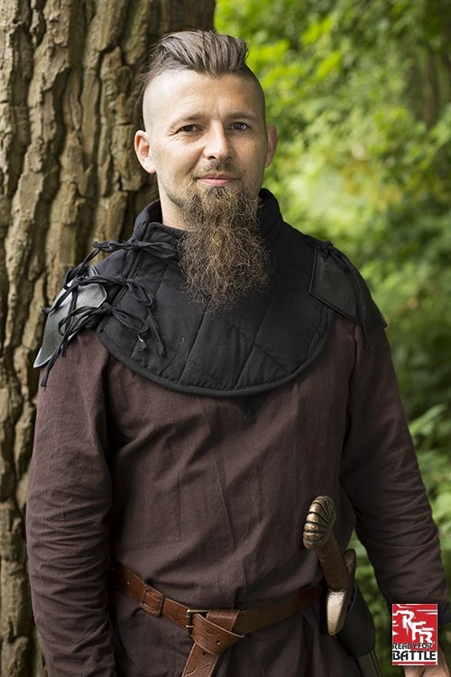 As a squire, you must wake with the sun to prepare for your training. You are responsible for your master as well as your extra chores, and it’s only after the morning’s water is boiled and you’ve set out your master’s clothing and polished armour that you are allowed to begin your drills.Also referred to as a gorget, which means throatEarly versions were typically worn under the breastplate and backplate to support the weight of the heavier plate armour¶Made from 1mm/19 gauge thick mild steelRolled edges with no sharp edgesStraps and fittings made from sturdy cottonHand made, welded pieces for maximum durabilityEpic Armoury Dark oxidization resistant coating¶Epic Armoury Dark products are specially treated to resist rust, but should still be treated with oil and kept in dry storage. ¶Cleaning¶If your armour does get wet, it is important that you dry it thoroughly as soon as possible.¶After handling, wearing, or after six months of storage or display, all metal should be wiped with a clean cloth. Lightly oil the clean surface with a quality machine or mineral oil. Alternatively, you can apply a coating of wax to the entire surface of exposed metal. Allow the wax to dry for a couple of hours and then buff it lightly with a soft cloth.¶Rust-Prevention and Removal¶Store your armour is a dry place and check it every couple of months for signs of rust. If any is found, remove it by gently rubbing the affected spot with a mildly abrasive pad dipped in paste wax, oil, or water-displacing liquid.¶Cotton Maintenance¶This heavy cotton product is heavier than medium cotton, almost like denim. This material wrinkles easily, but can be ironed on a medium heat level. ¶Machine wash at 40°C / 104°F. Wash separately the first time and with similar colours afterwards. Tumble dry on low heat, but be aware that it might shrink up to 5%. For general stains or discoloration, treat with a commercial fabric cleaner, or blot with tepid water and a soft cloth.¶