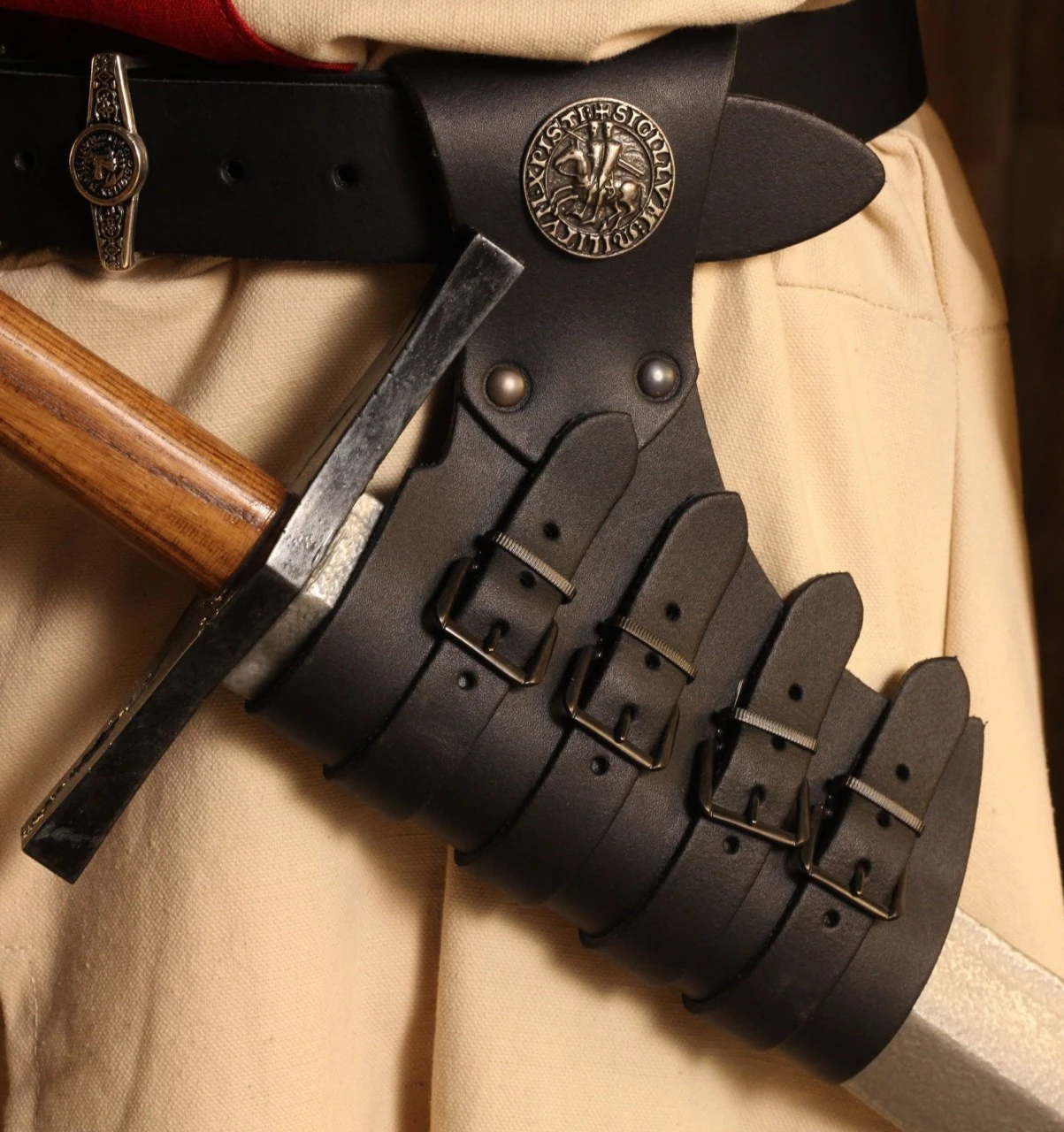 This Authentic Templar Scabbard with Straps is a great example of this iconic Medieval accessory, allowing you to add an historically inspired dimension to your Renaissance, Larp, Fantasy, or Norse costume collection. Featuring four practical buckles that can be adjusted with ease, this scabbard boasts a decorative rivet and is made from genuine leather.