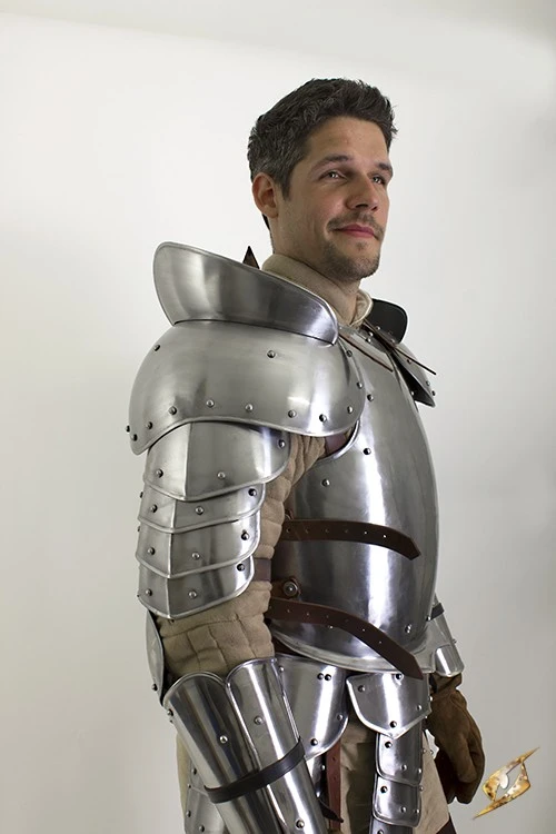 Epic Armoury’s Shoulder Plate Giant Warrior are a set of two shoulder guards designed to protect the shoulder-joints and upper arm. This armour’s metal plates overlap one another to provide complete laminate protection. Overlaying the spaulders is a large pauldron, which provides additional protection to joints and armpits. Atop the pauldron a vertical plate sword breaker catches and deflects blows before they can impact the head. The sword breaker is slightly concave and somewhat higher at the back than the front, thus providing protection without impairing vision. Although the armour is designed to match Epic Armoury’s ‘Warrior’ set, it is fully interchangeable with other Epic Armoury armours in order to fully customize your character’s look.