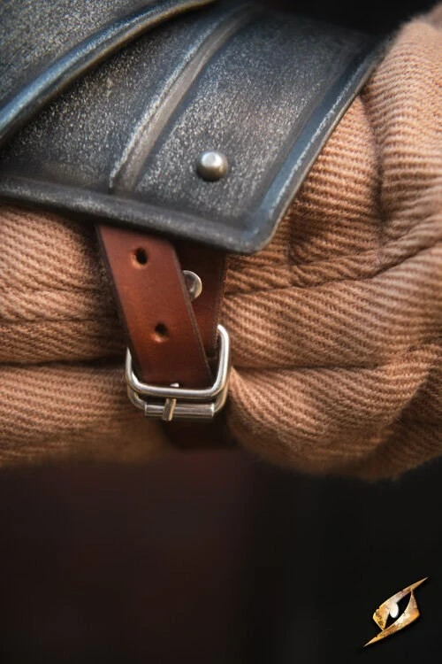 Epic Armoury’s Shoulderplates are a set of two shoulder guards with spaulders. The spaulders have three ridged metal plates–or lames–overlaying one another to provide laminate protection of the upper arms. The shoulderplates are fastened with leather straps around the biceps and at the shoulder blade, attaching to a breastplate. Epic Armoury breast- and backplates can be purchased separately and have fittings for mounting the shoulders.