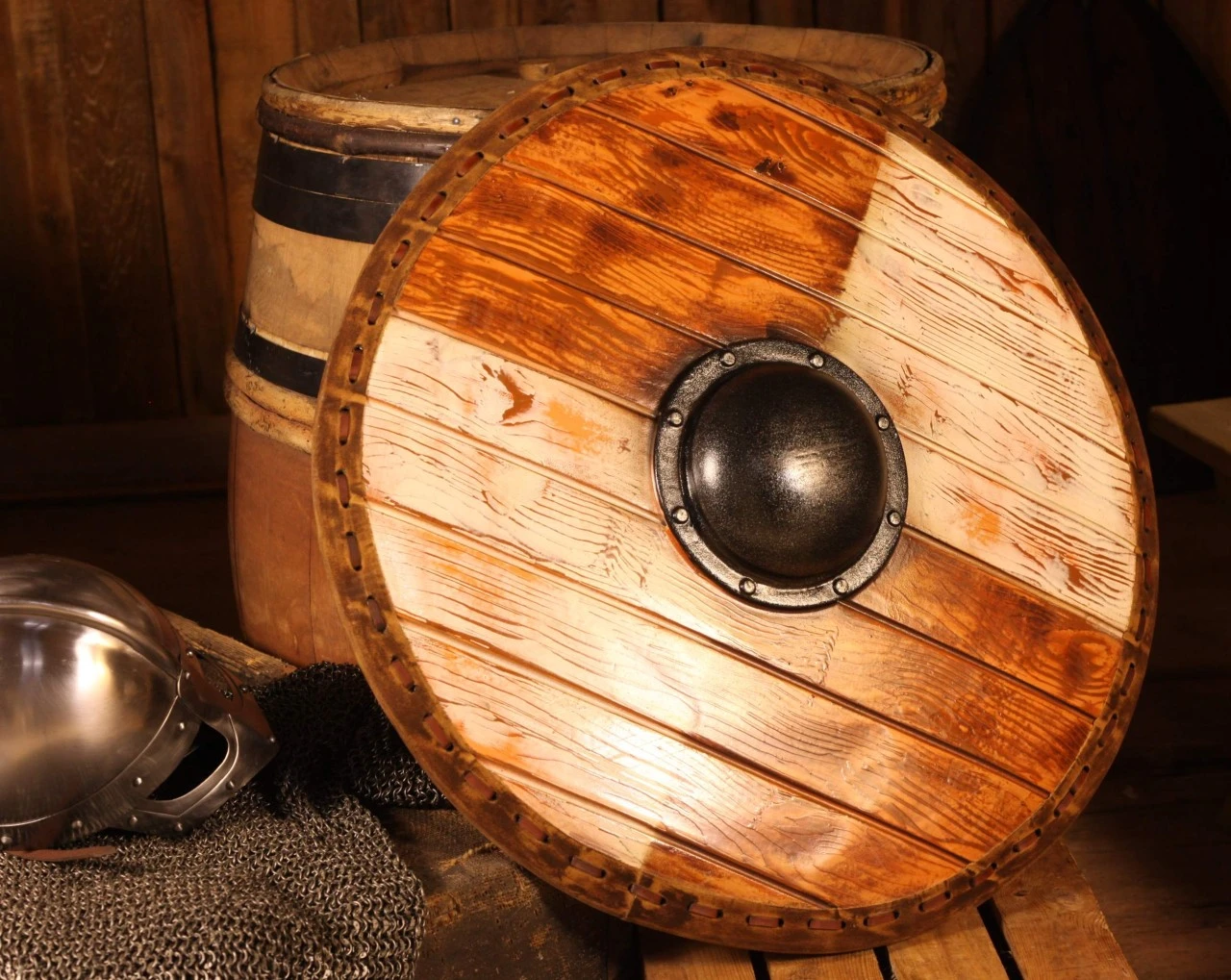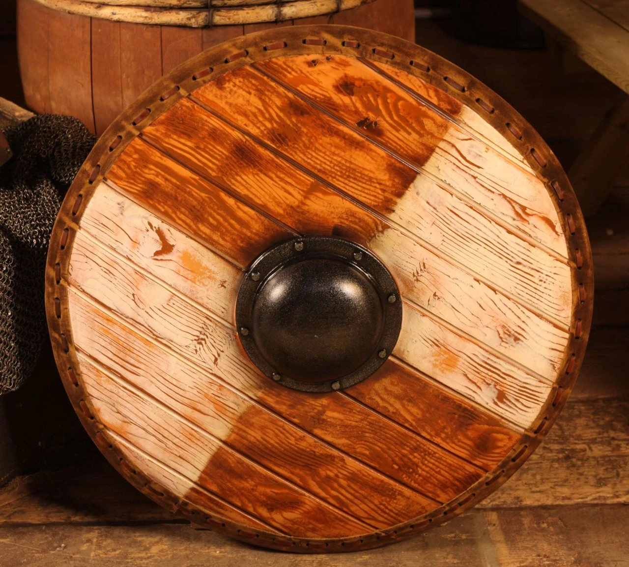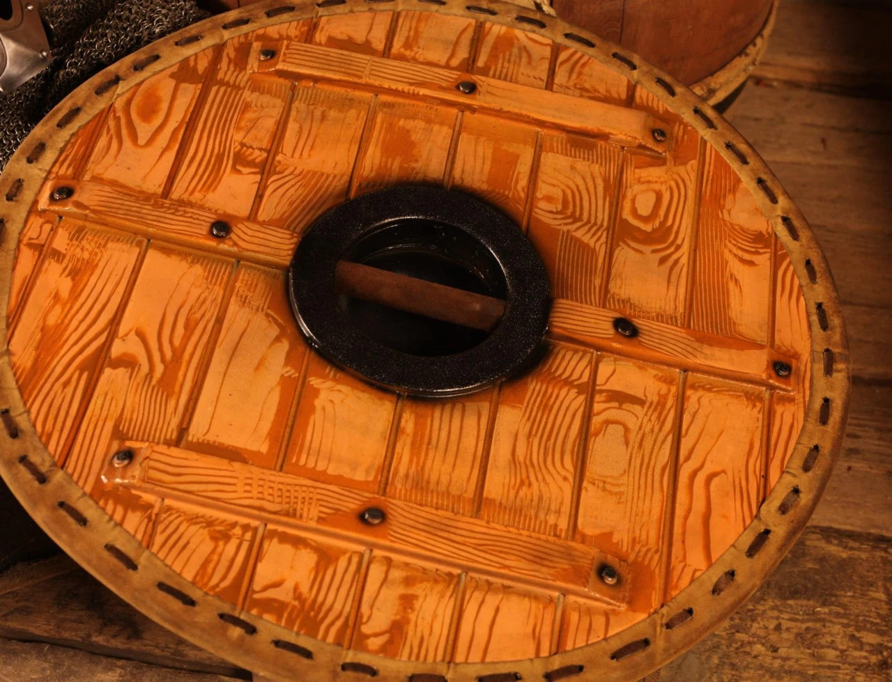 Inspired by early Vikings and Saxons, this Live Action Role Play (LARP) safe shield is carved from EVA foam to look like true wood trimmed with real leather.