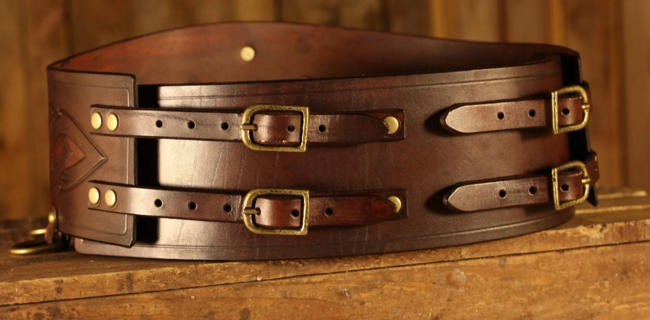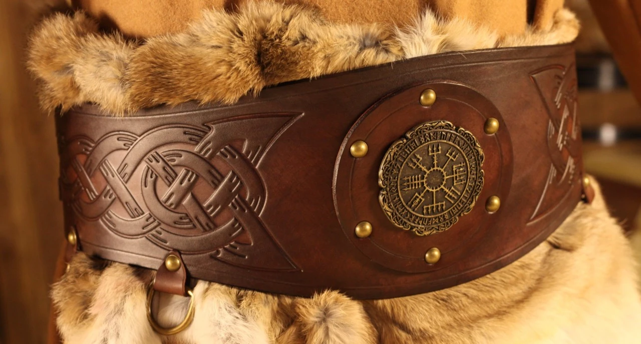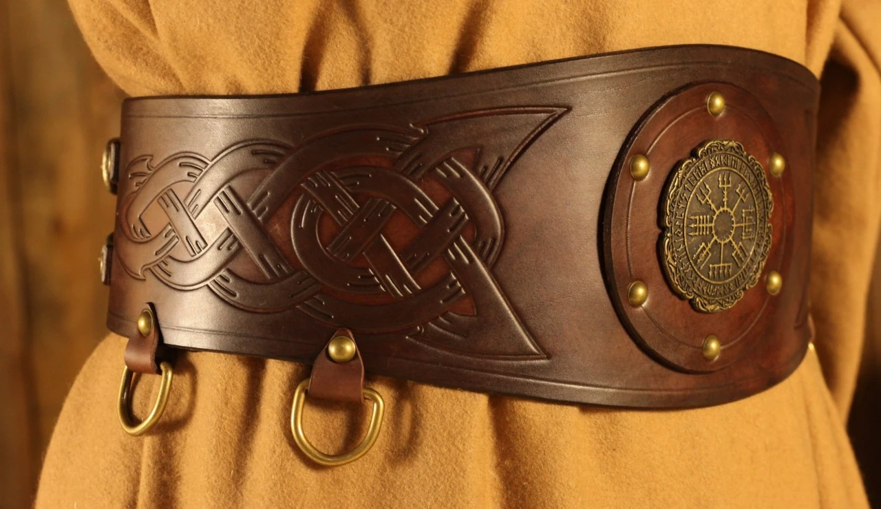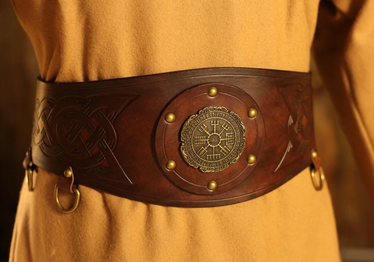A fantastic viking broad belt Halfdan, made of 3-3.5mm veg tan leather, 15cm (6 inches) wide in the center, 10cm (4 inches) in the ends, decorated with a VegvÃsir rivet and norse embossings. Four metal D rings help you attaching your kit. Four metal buckles and metal loops add the final touch.