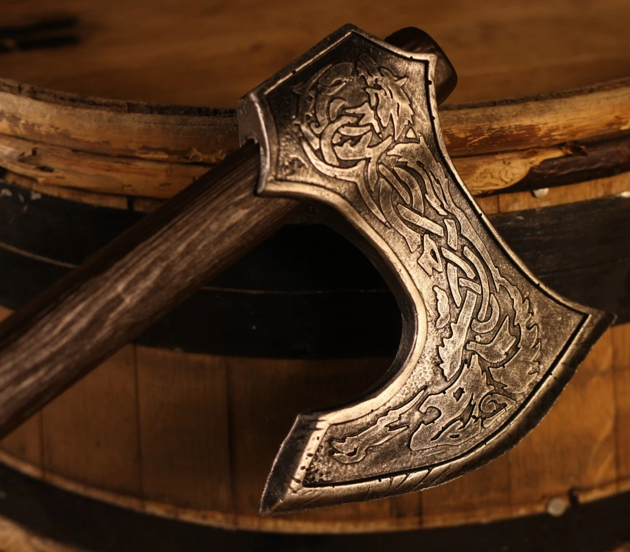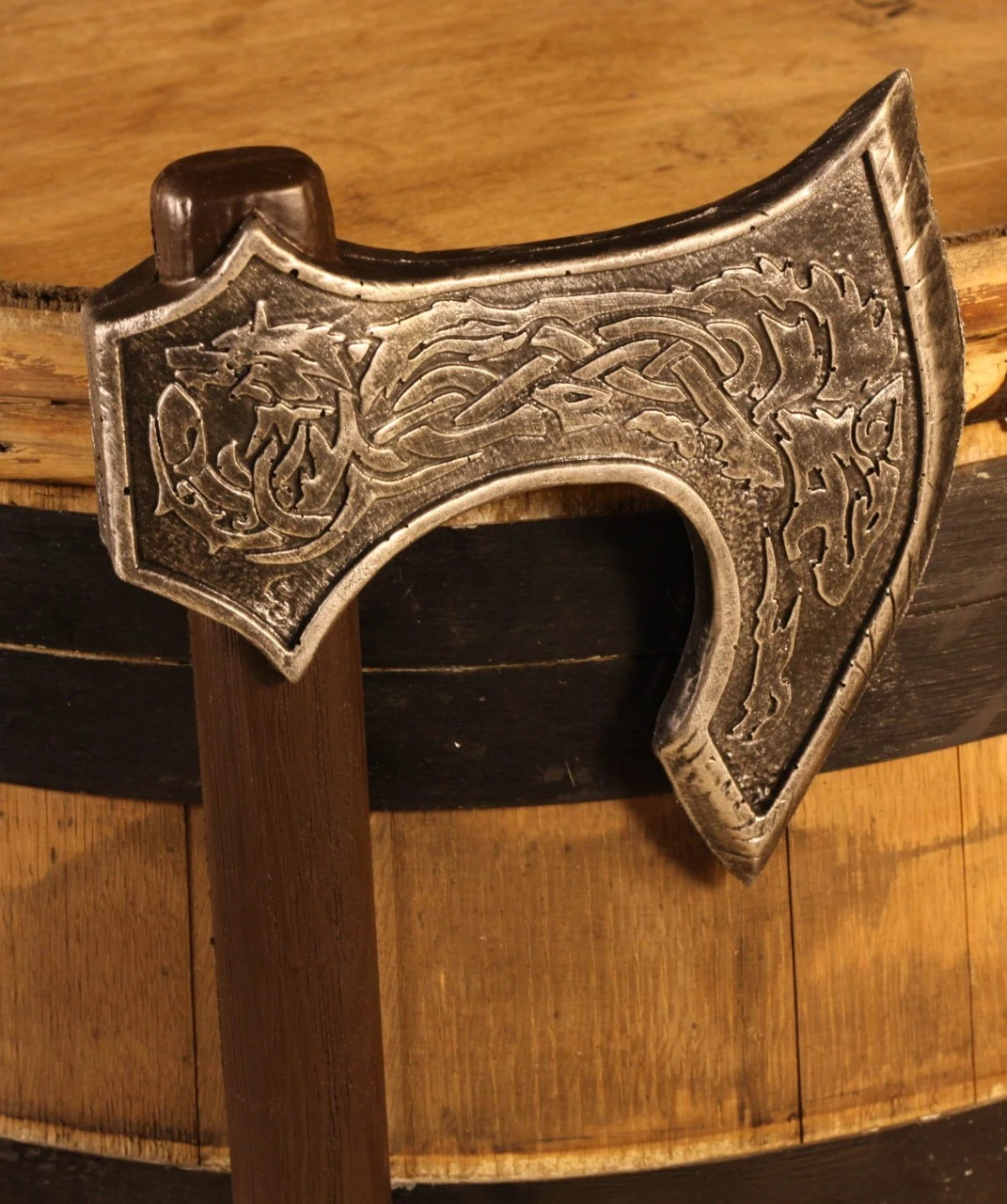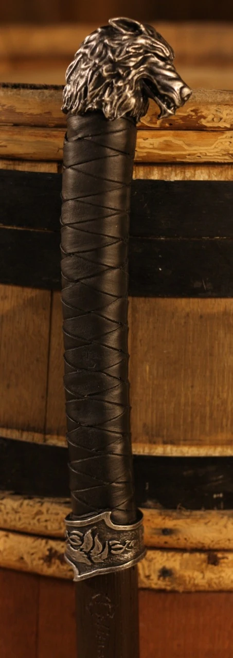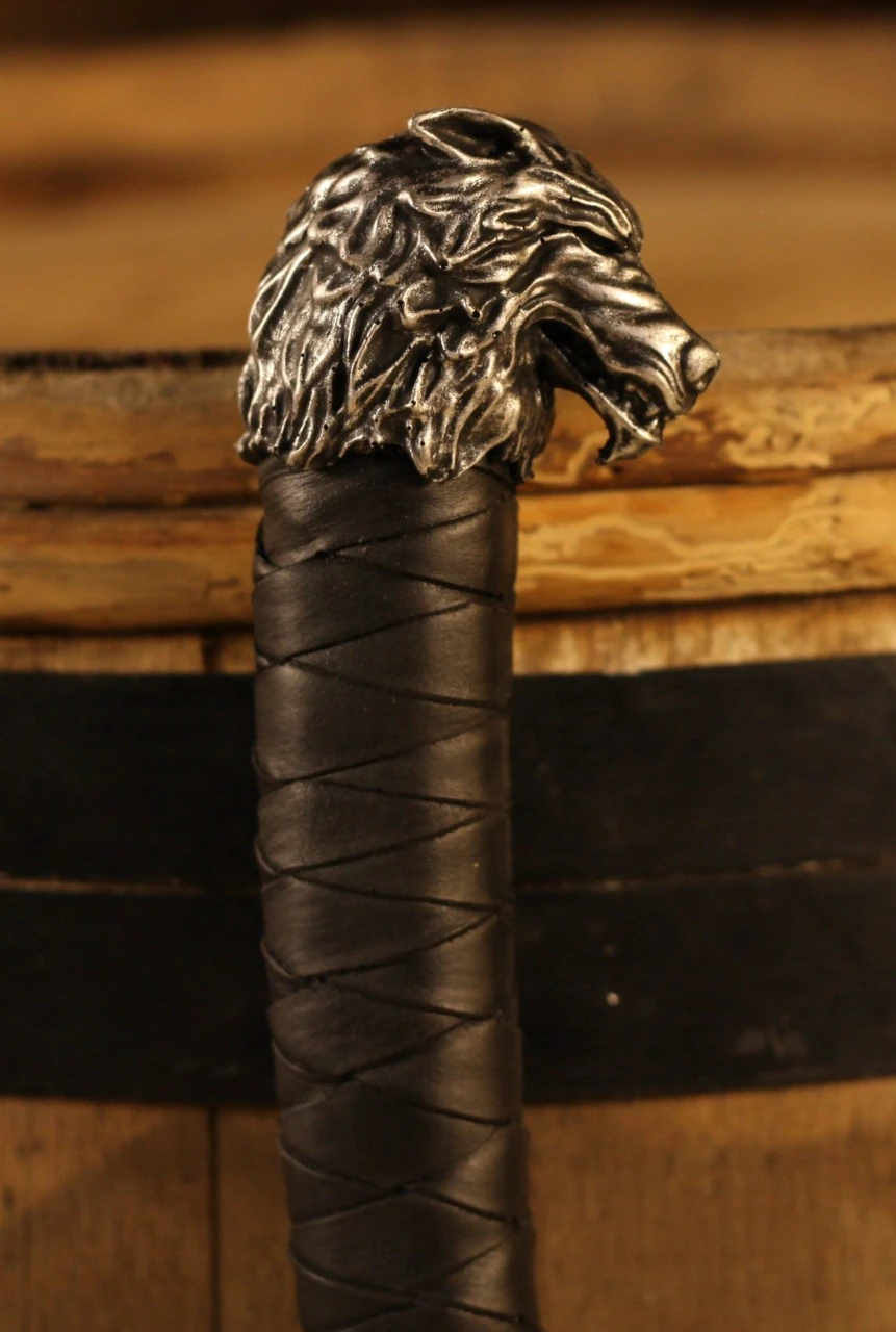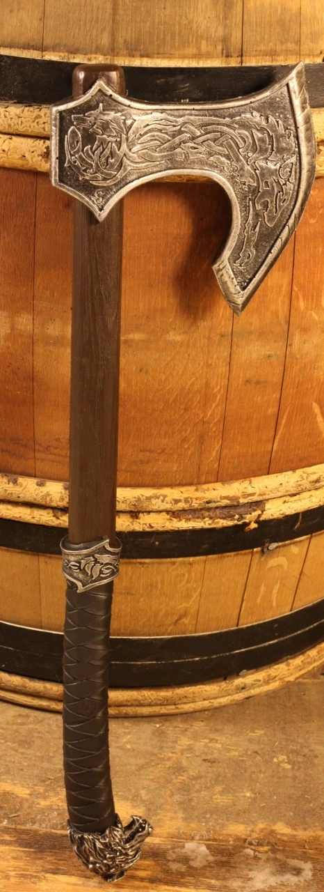 The Krieger axe features a steel head with a celtic wolf engraved. The black handle imitates leather for a firm grip, while the pommel is shaped like the head of an incredibly detailed dire wolf.