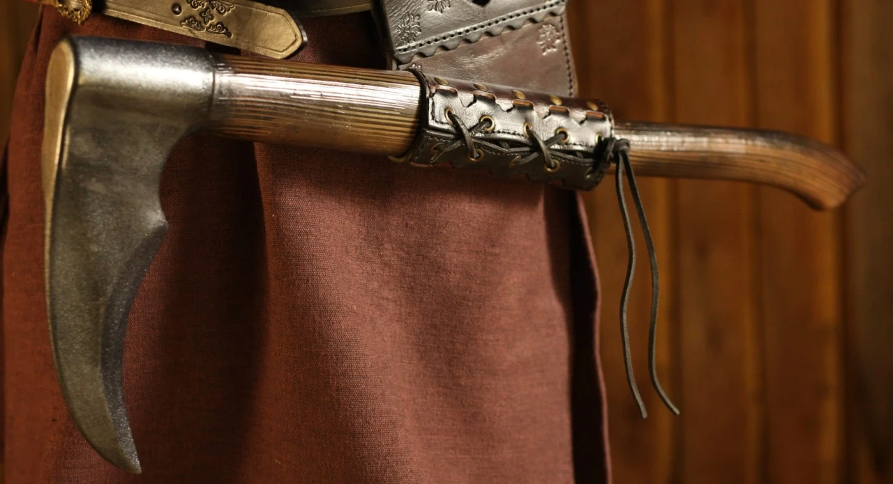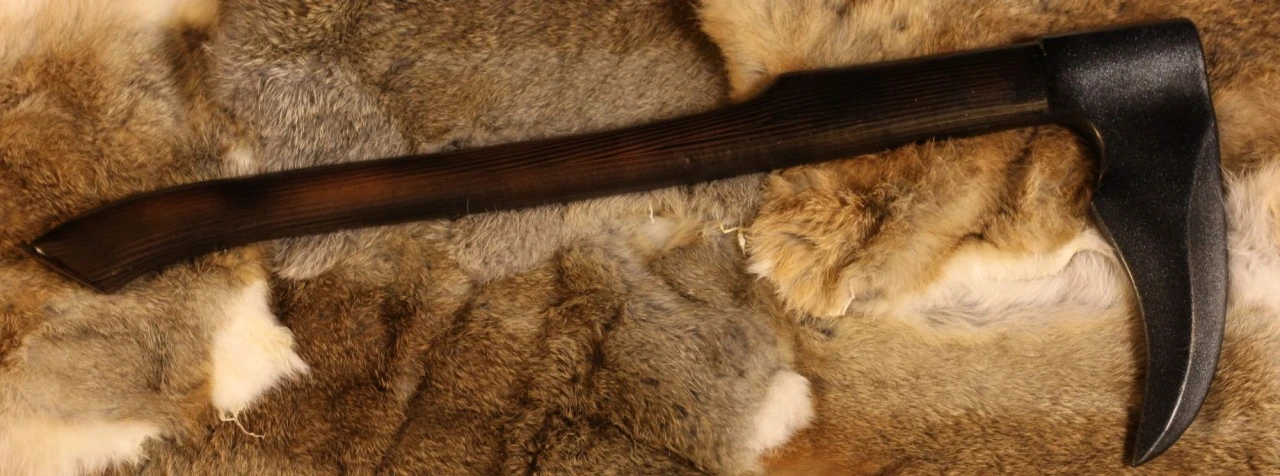 Epic Armoury’s War Scythe is a 60 cm latex short axe with a 20 cm blade. The weapon is entirely handpainted with wood-grain and metal finishes. The blade is angled and designed to match the realism of the traditionally shaped handle, with a deadly hook at the end inspired by the weapons that could rip through armour…as well as more obvious farmer’s tool!