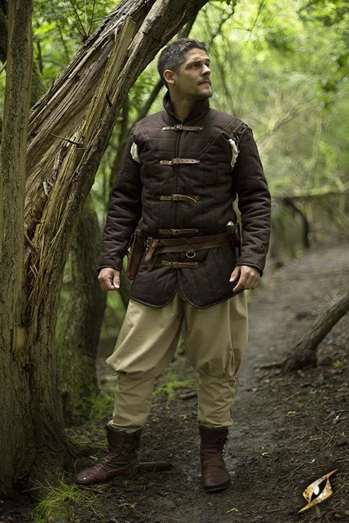 The brown warrior gambeson is a padded long-sleeved coat that covers the upper part of the body from the neck to the hips on the front and back.