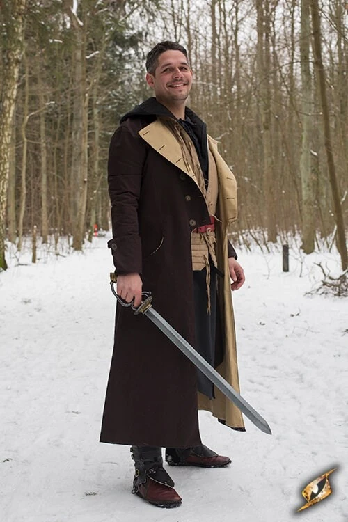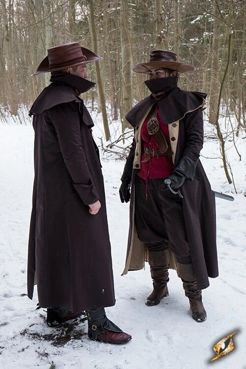 This Coat Hellsing is a sleek and long-sleeved duster with an impressive mantle (collar) designed for magic hunters. Reaching from the neck to the mid-calf, this coat is designed to protect you from the elements while adding a serious, professional appearance. The coat is made from canvas and embellished with a contrasting lining. The slit up the back provides better movement, including comfort on horseback