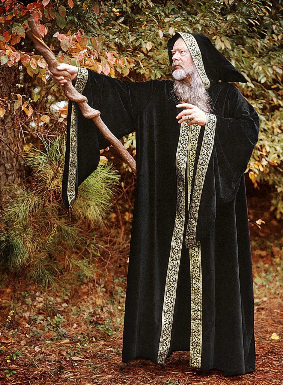 Wizard’s black hooded cloakTerrific black hooded cloak for sorcerers, made of velveteen, embellished with a beautiful golden trim on the hood, the wide bell sleeves and the front opening. The large hood will hide your face easily when casting mighty spells over your enemies. With a length of 155cm from shoulder to hem this wizard’s cloak will hide even taller persons.
